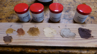 Damit Kitt für Eichen- und Buchenholz den richtigen Ton erhält, kann man Eiche-Schleifstaub einmischen, oder gibt der Stammlösung das Pigment Eisenoxidbraun dazu (Nr.7). Einen rötlichen Ton erhält man durch Zugabe von Terra di Sienna, gebrannt (Nr.3). Terra di Sienna natur verändert den Ton nicht so sehr (Nr.4). Will man den Ton aufhellen, nimmt man das Pigment Titanweiss. Immer nur minimal, weniger als eine Messerspitze dazugeben. Bei Titanweiss habe ich festgestellt, das es von Vorteil ist, dieses in der Stammlösung zu verrühren und dann erst Füllmaterial dazuzutun. Im fertigen Kitt eingerührtes Titanweiss ließ sich schlecht verrühren und es gab weiße Punkte im Kitt.